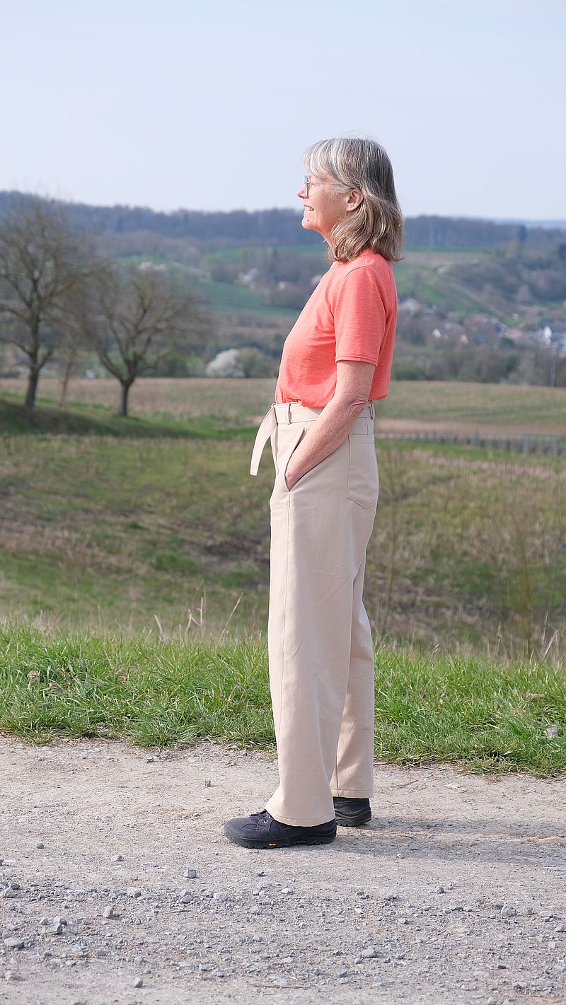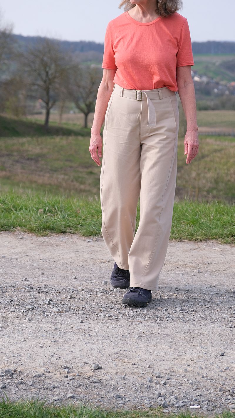 Genäht habe ich die Hose aus einem eher dünnen Twill, soll ja auch eine Sommerhose sein. Wahrscheinlich fällt sie aus einem dickeren Stoff wie einem Denim wieder anders, und dann würde mich die überschüssige Weite noch mehr stören. Die Farbe des Stoffes ist etwas undefinierbar zwischen beige und grau und überraschend schwer zu kombinieren. Das korallenrote T -Shirt (Schnitt: Erica von Fibremood) gefiel mir am besten dazu. Und mit dem Sweatshirt (Capitol von Cozylittleworld) war ich dann passend für diese etwas kühle Frühlingswanderung angezogen.